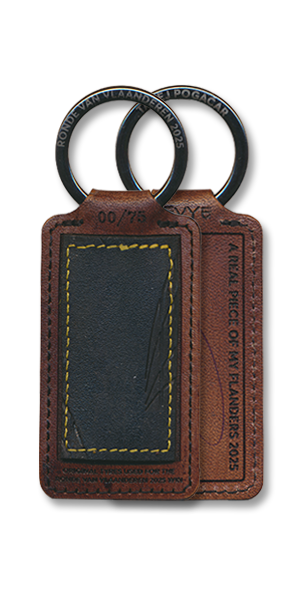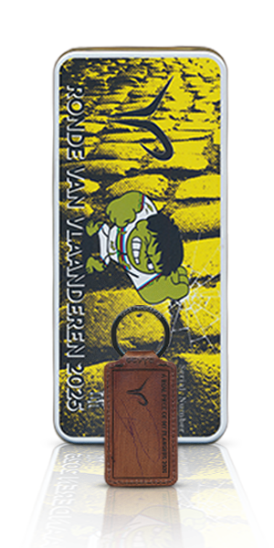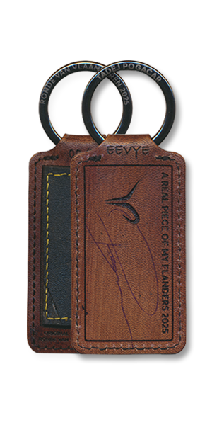 75 limited-edition leather keychains have been created, entirely handcrafted, using an authentic piece of the tire from the bicycle on which Pogačar conquered the Ronde Van Vlaanderen.
