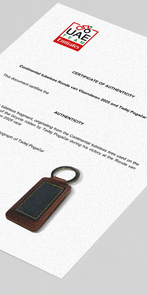 Sono stati realizzati 75 portachiavi in pelle in edizione limitata, interamente lavorati a mano, utilizzando un frammento autentico dei copertoni della bicicletta con cui Pogačar ha conquistato il Giro delle Fiandre.